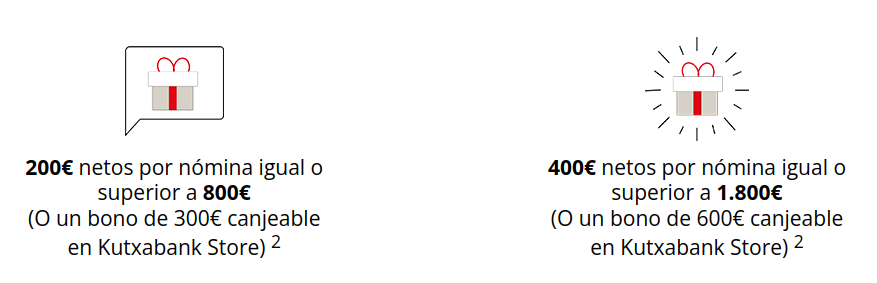 Pero además, buscan la vinculación de ese público joven con un incentivo económico para aquellos que domicilien nómina. Por ejemplo, aquellos que domicilien una nómina igual o superior a 1.800 euros al mes obtendrán un cheque de 400 euros netos o bien, un bono de 600 euros para gastar en la tienda Kutxabank online, donde podrán adquirir productos tecnológicos de Apple, Garmin, Samsung, Sony o incluso, bicicletas Orbea entre otros. La misma promoción para clientes fuera de este ámbito de edad requiere una nómina igual o superior a los 2.500€. Si la nómina es inferior a esa cifra pero superior a 800 euros, el cheque ofrecido será de 200 euros o bien, un bono para canjear en su tienda de 400€, para las personas fuera de este ámbito de edad, el bono sería únicamente de 300€.