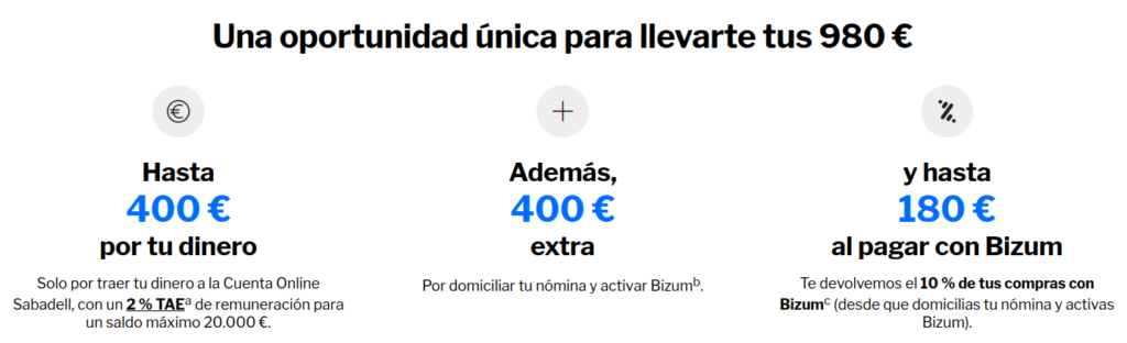 Con motivo del Black Friday incrementan la bonificación a ofrecer a los nuevos clientes que abran su Cuenta Online, domicilien nómina y realicen pagos con Bizum hasta llegar a un total de 980 euros, cuyo importe nace de los siguientes tres tramos: