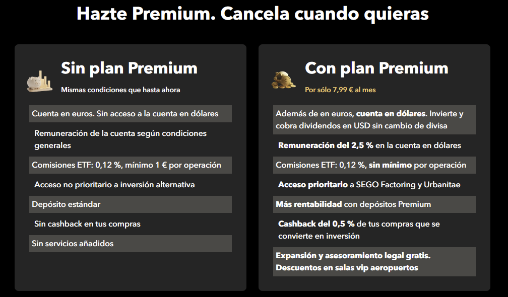 - La posibilidad de invertir en ETFs sin una comisión mínima por operación a diferencia de la comisión de 1€ en el plan que no es de pago, manteniendo la misma comisión del 0,12% del valor del mismo.