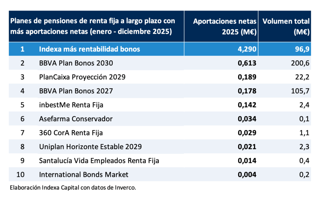 En cuanto a la renta fija, el plan de pensiones Indexa Más Rentabilidad Bonos, con código DGS N5137, se convierte en el más contratado, con una diferencia abrumadora sobre el segundo y posteriores, tal y como indica el siguiente ranking: