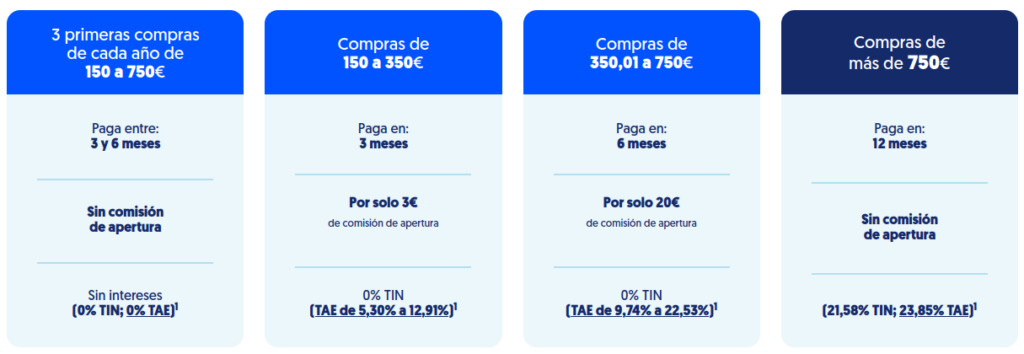 La tarjeta WiZink Aplázame no ofrece ningún cashback, pero permite aplazar las primeras 3 compras del año entre 150 y 750 sin ningún tipo de interés ni comisión de apertura y las restantes con unas comisiones y tipos que podéis ver a continuación: